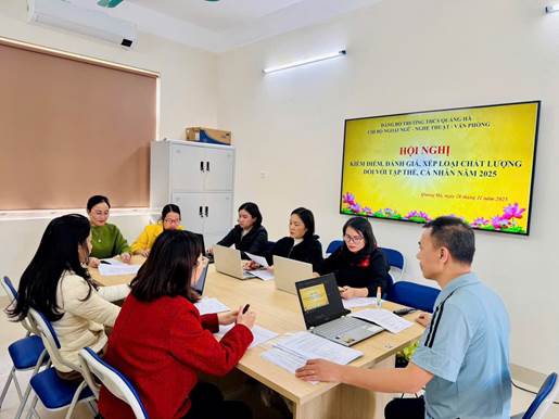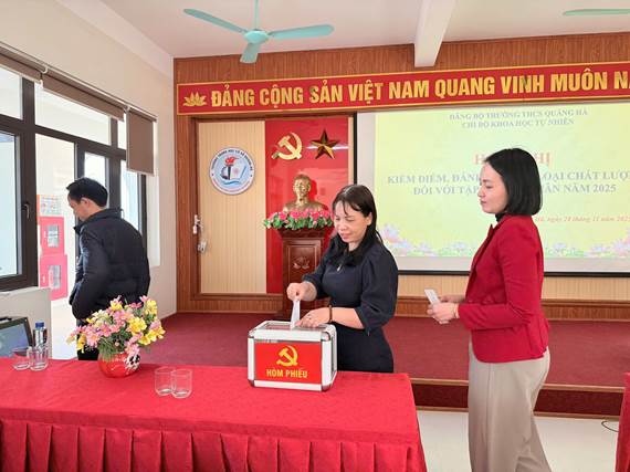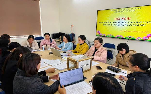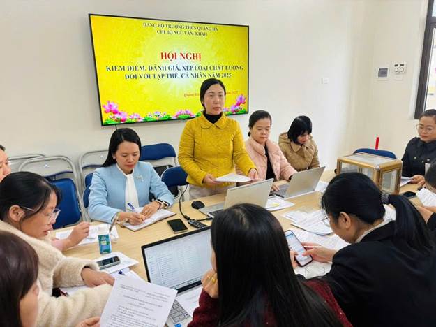 Thực hiện Kế hoạch số 38-KH/ĐU của Đảng uỷ xã Quảng Hà, chiều ngày 28/11/2025, 4 Chi bộ trực thuộc Đảng bộ Trường THCS Quảng Hà đã đồng loạt tổ chức Hội nghị kiểm điểm, đánh giá và xếp loại chất lượng đối với tập thể, cá nhân năm 2025 theo đúng quy trình, hướng dẫn của Đảng ủy cấp trên.