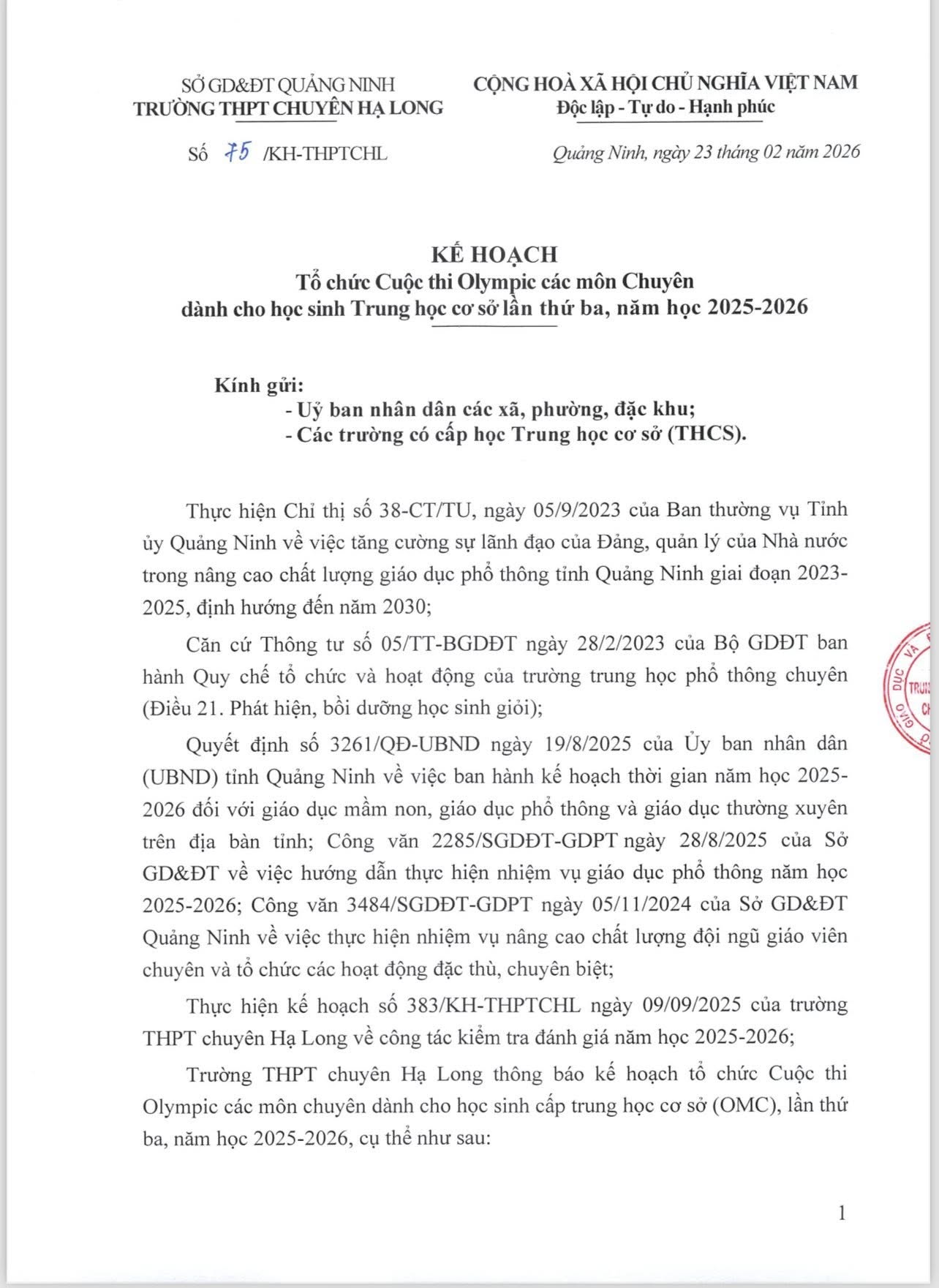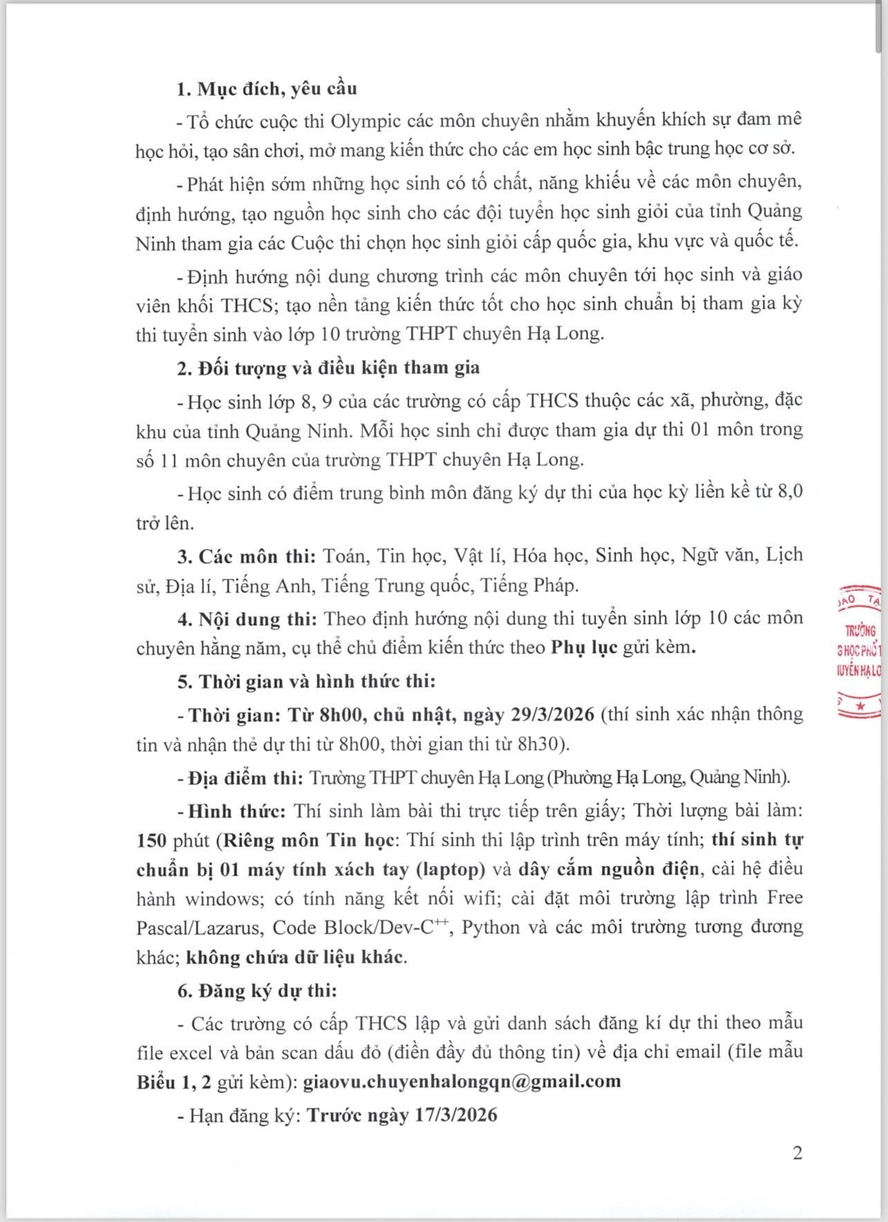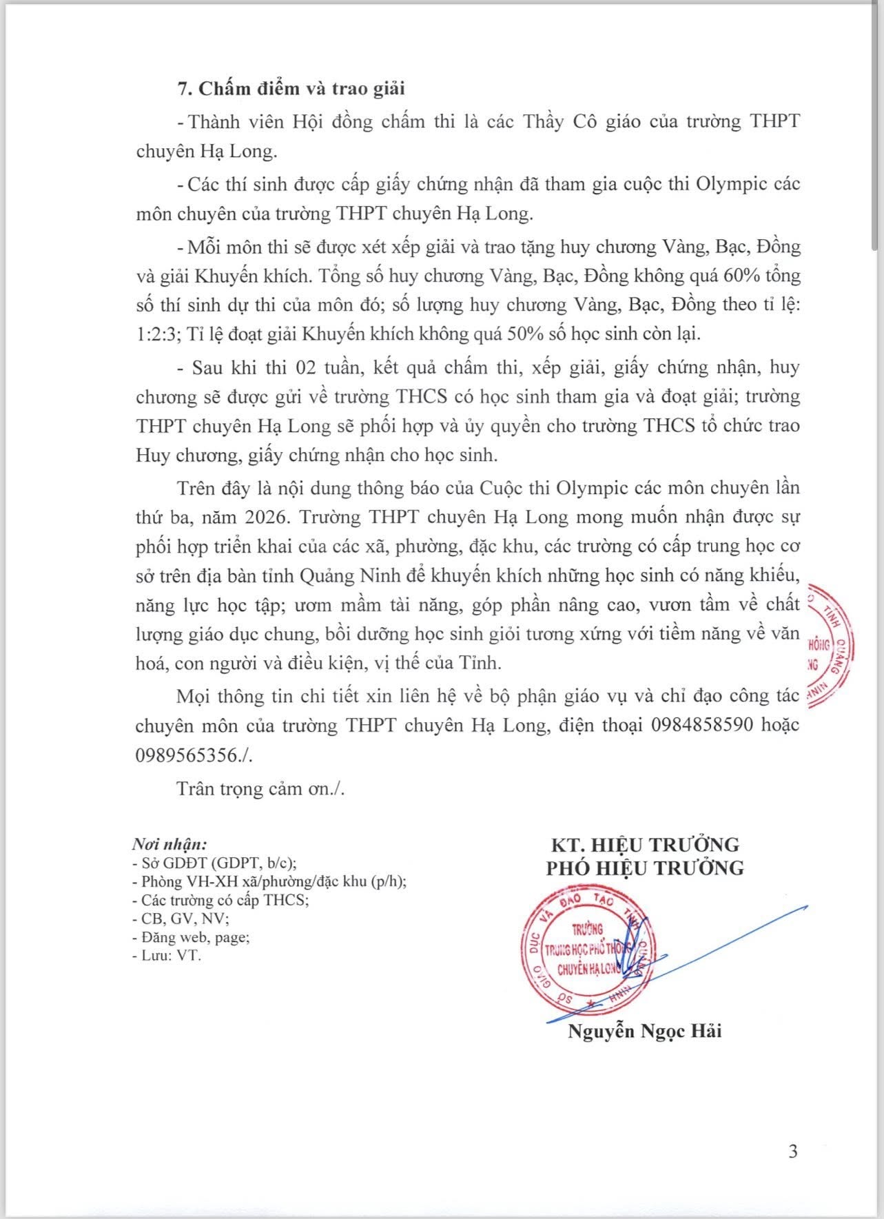 THÔNG BÁO VỀ CUỘC THI OLYMPIC CÁC MÔN CHUYÊN DÀNH CHO HỌC SINH THCS LẦN III DO TRƯỜNG THPT CHUYÊN HẠ LONG TỔ CHỨC