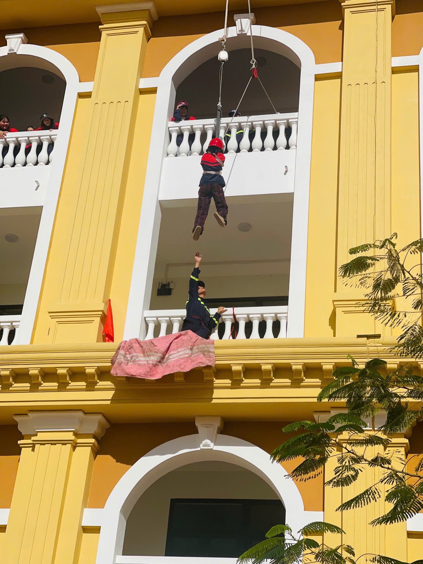 Các em học sinh rất hoà hứng với phần trải nghiệm thoát hiểm bằng thang dây và dây thả chậm