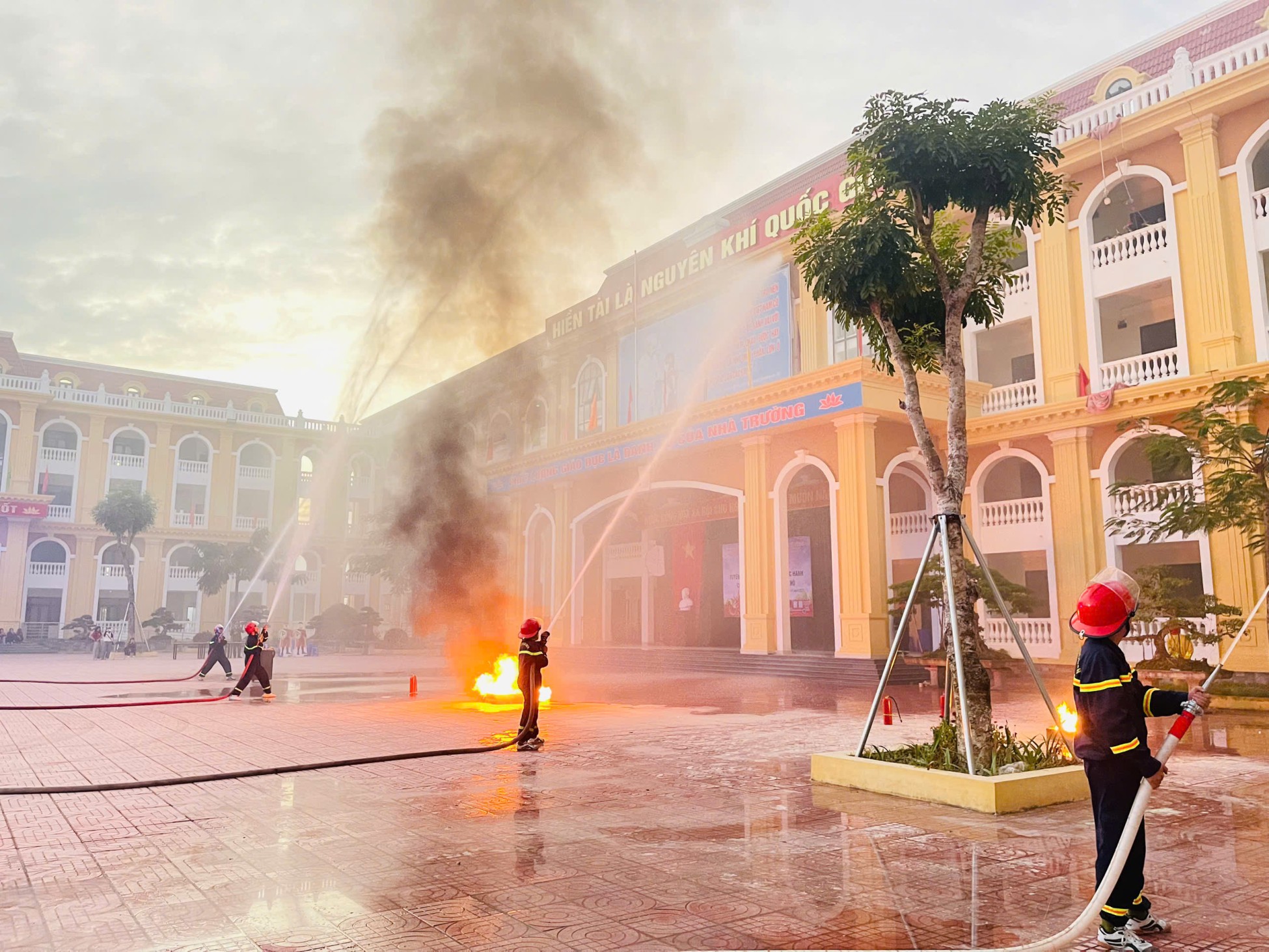 Các thầy cô giáo tham gia diễn tập tình huống cháy
