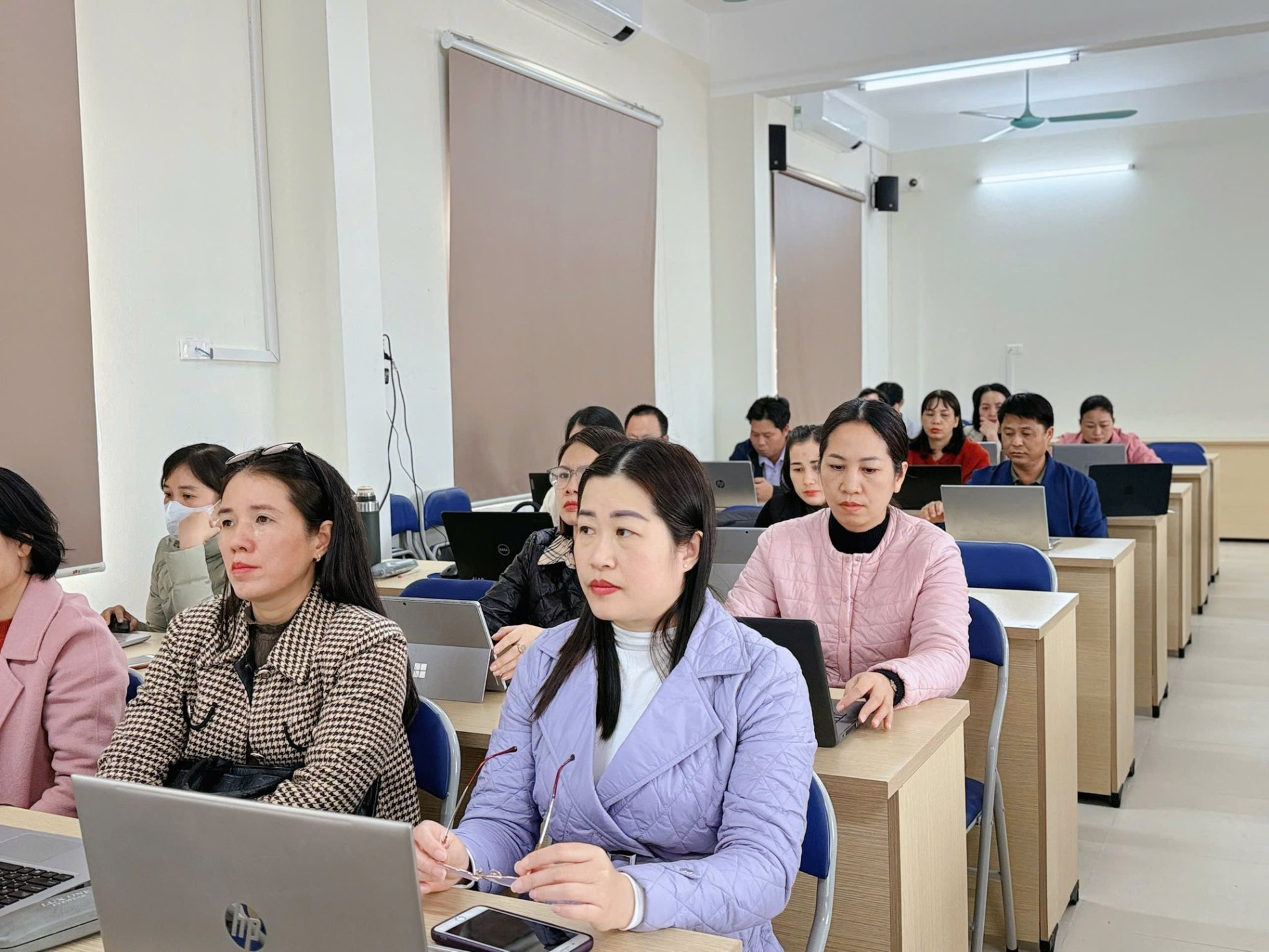 Trong buổi tập huấn, các thầy cô đã được hướng dẫn, trao đổi và thực hành các nội dung thiết thực giúp tích hợp năng lực số vào bộ môn giảng dạy, vận dụng công nghệ thông tin hiệu quả trong quản lý, giảng dạy và tổ chức hoạt động học tập cho học sinh.